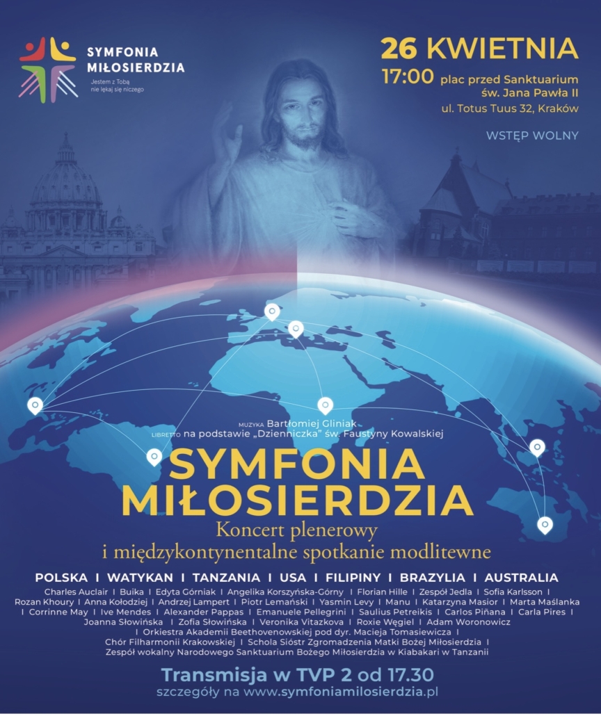 - Trwa nowenna przed Świętem Bożego Miłosierdzia w przeszłą niedziele. Zapraszamy w sobotę 26 kwietnia, w wigilie tego Święta do Sanktuarium św. Jana Pawła II na niecodzienne czuwanie w intencjach Pokoju, pt. „Symfonia Miłosierdzia”. Początek o godz. 17.00. Wstęp wolny. Równocześnie informujemy, że transmisja z tego czuwanie w TVP 2., początek od godz. 17.30