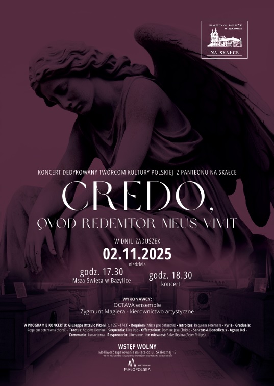 2 listopada, w Dzień Zaduszny, naszą modlitwa obejmujemy naszych bliskich zamarłych. Od 1880 roku, na krakowskiej Skałce znajduje się Krypta Twórców Kultury Polskiej, w której w czternastu sarkofagach znajdują się szczątki doczesne wybitnych Polaków. Paulini od początku powstania Krypty opiekują się tym szczególnym dla Karkowa i Polski miejscem, usytuowanym w narodowym Sanktuarium Męczeństwa św. Stanisława. Koncertem 2 listopada, pt. „Memento mori…” w wykonaniu OCTAVA ensemble, pod kierownictwem artystycznym Zygmunta Magiery, pragniemy modlić się i oddać cześć wybitnym Twórcom kultury.