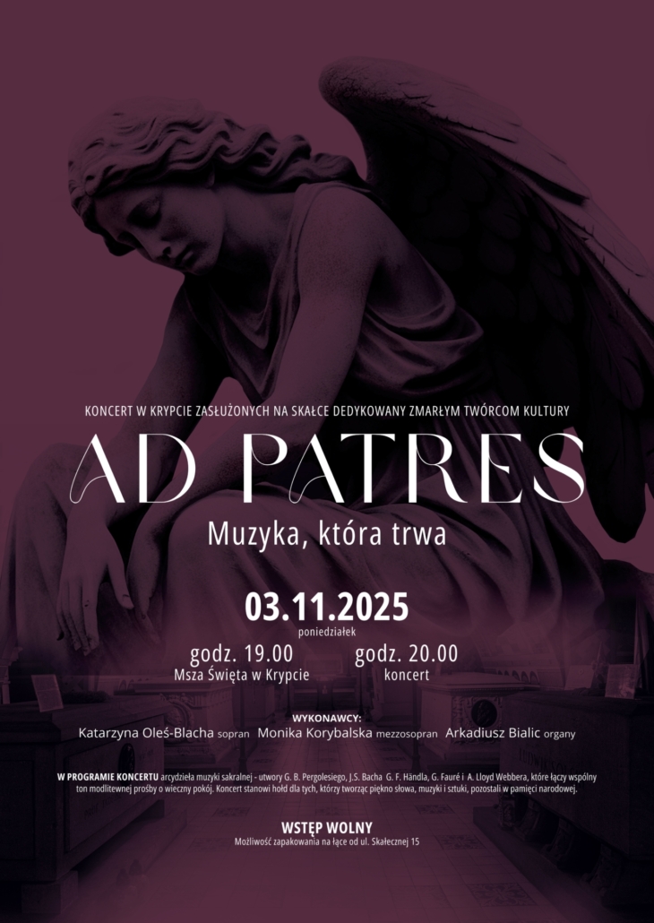 Wieczór „Ad Patres – Muzyka, która trwa” stanowi refleksję nad przemijaniem i duchową nieśmiertelnością Twórców Kultury spoczywających w Krypcie Zasłużonych na Skałce. W symbolicznej przestrzeni Panteonu zabrzmi muzyka, która od wieków towarzyszy modlitwie, zadumie i artystycznej kontemplacji.