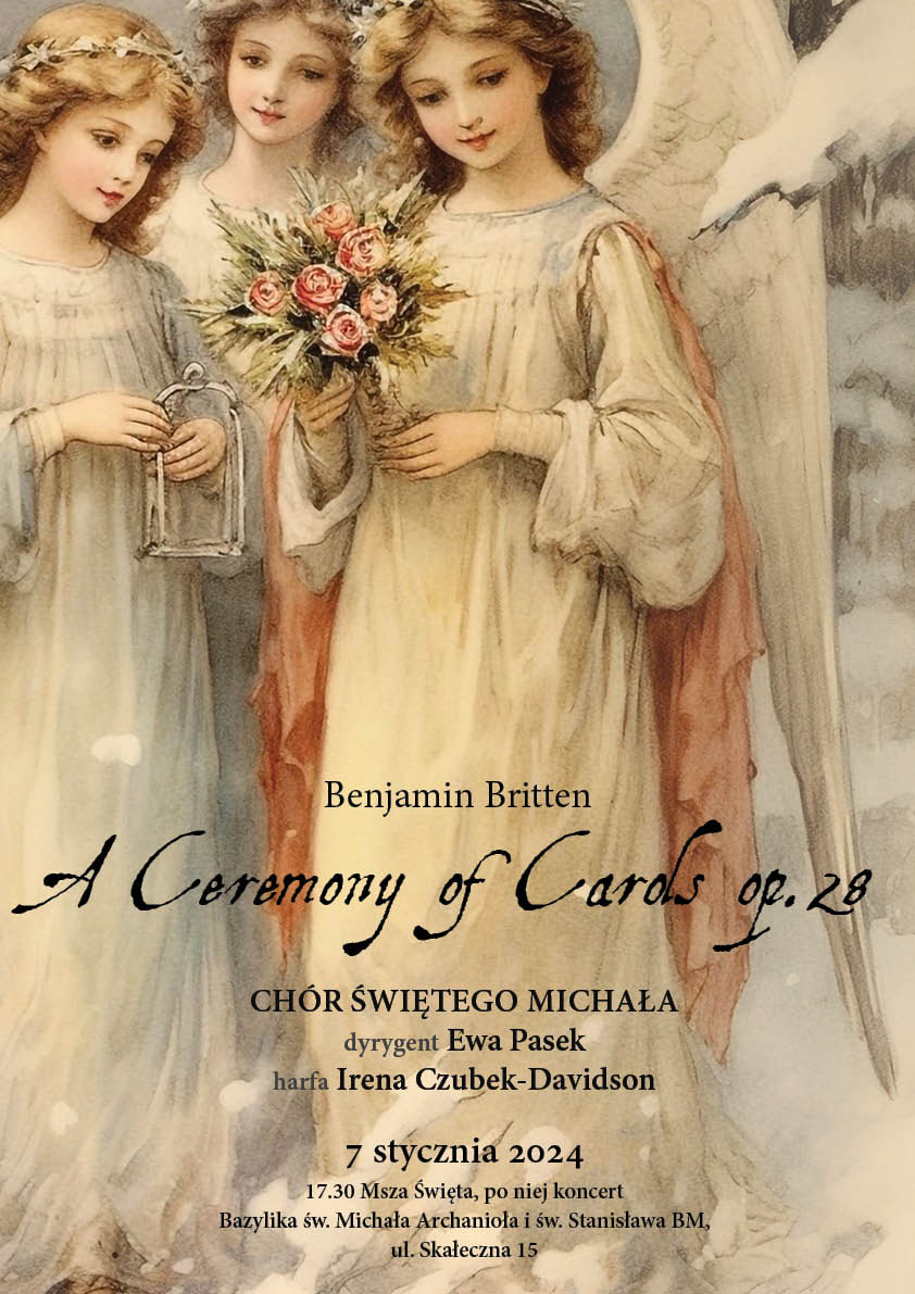 „A Ceremony of Carols” to niezwykły koncert bożonarodzeniowy w wykonaniu Chóru Świętego Michała pod dyrekcją Ewy Pasek. W czasie koncertu wykonane zostaną utwory przeznaczone na nietypową i niezwykle efektowną obsadę – chór żeński i harfę. Koncert pozwoli na zanurzenie się w dwie muzyczne tradycje związane ze świętami Bożego Narodzenia. Wysłuchamy polskich kolęd i pastorałek opracowanych przez krakowskiego profesora św. pamięci Jacka Targosza oraz cyklu utworów bożonarodzeniowych angielskiego kompozytora Benjamina Brittena “A Ceremony of Carols”.