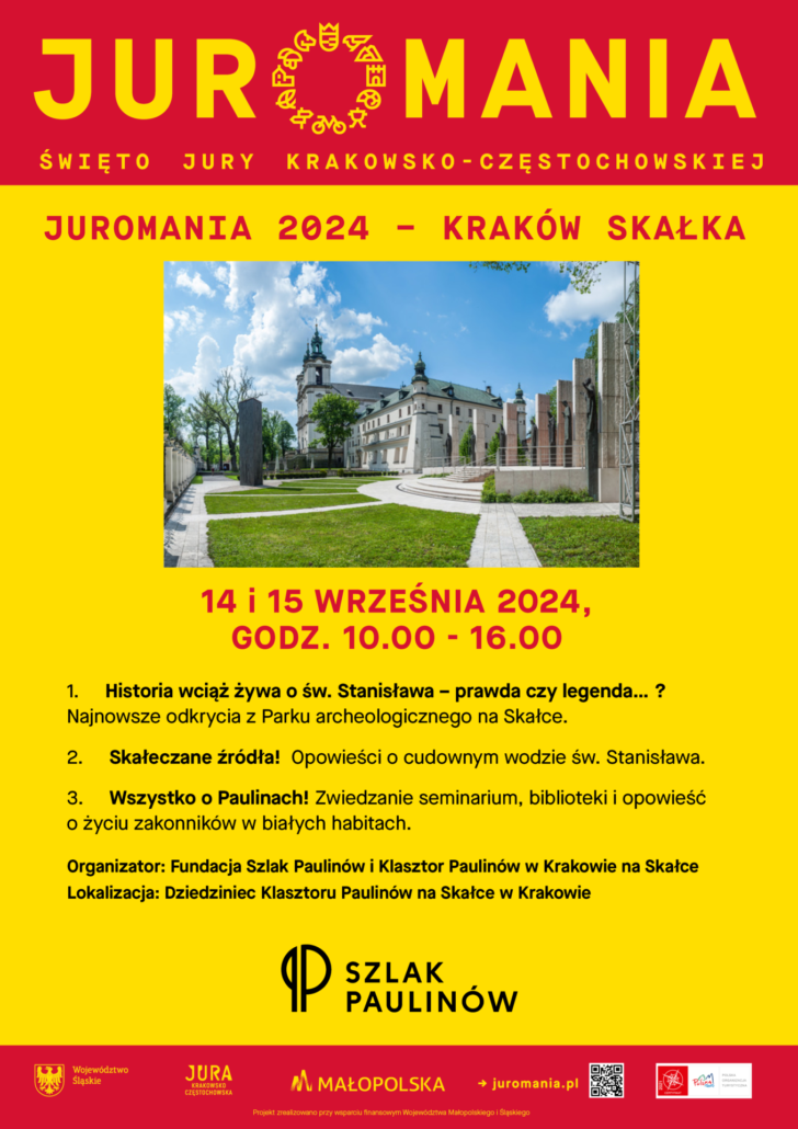 5. W najbliższą sobotę i niedzielę (14 i 15 września) zapraszamy na kolejną edycję święta Jury krakowsko-częstochowskiej, tzw. JUROMANIĘ. Organizatorzy zachęcają do odwiedzania niezwykłych 50 miejsc na Jurze. Na Skałce zwiedzanie z przewodnikiem w godz. 10.00 – 16.00. Szczegóły na stronie Juromanii, plakatach i na stronie Skałki. Wstęp wolny.